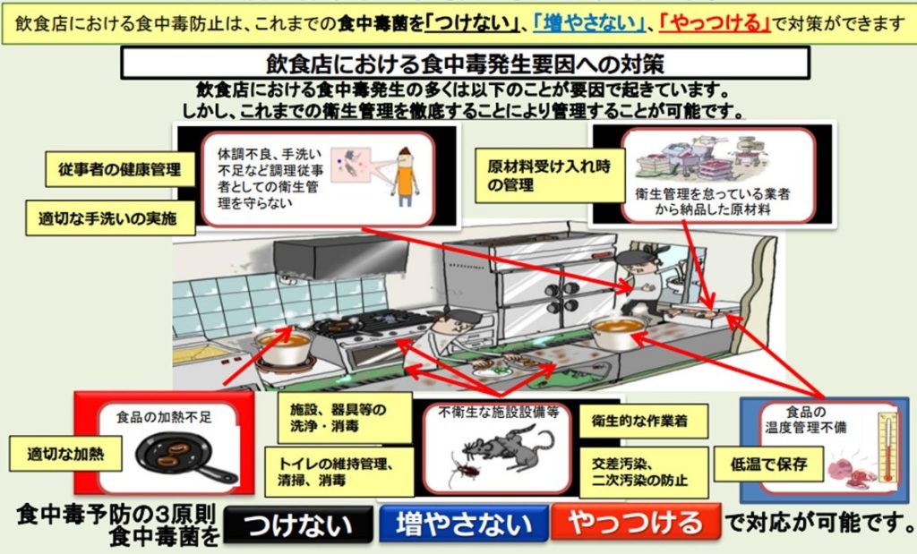 また、その9項目を、いわゆる「食中毒予防の3原則」(つけない、増やさない、やっつける)と対照させています(ちなみに、ノロウイルス食中毒の予防の場合、3原則に「持ち込まない」を付けて「4原則」としている場合があります)。